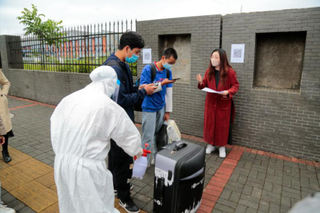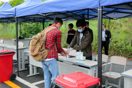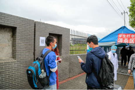 清晨,教职工各就其位,各司其职,热情欢迎学子归来。在老师的指引下,行李消毒、检测体温、身份识别、健康码扫码、发放通行证、洗手消毒、更换口罩等各项工作有条不紊地进行。同学们按要求距离排队,严格完成相关流程且检测合格后回到熟悉的校园,准备开始新的学习生活。现场秩序井然,美丽的校园又恢复了往日的生机与活力。
