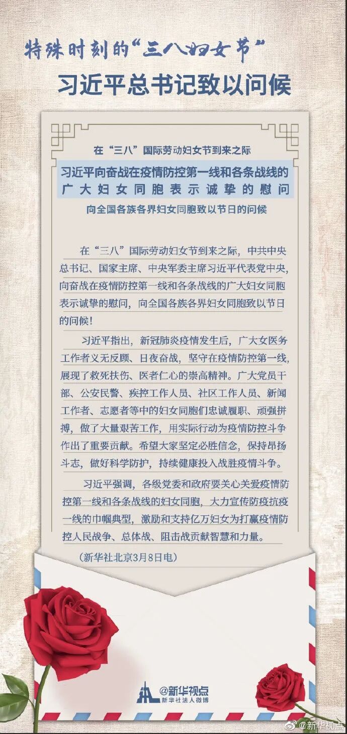 在“三八”国际劳动妇女节到来之际,中共中央总书记、国家主席、中央军委主席习近平代表党中央,向奋战在疫情防控第一线和各条战线的广大妇女同胞表示诚挚的慰问,向全国各族各界妇女同胞致以节日的问候!